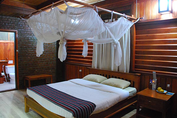 Bungalows are built identical to local homes in the region using locally available materials. All rooms come with attached bathroom, hot and cold shower. Rooms are secure, lockable with windows offering scenic view. An elegant lobby includes bar area, fire place, dinning area and common area offers recreation and relaxation.